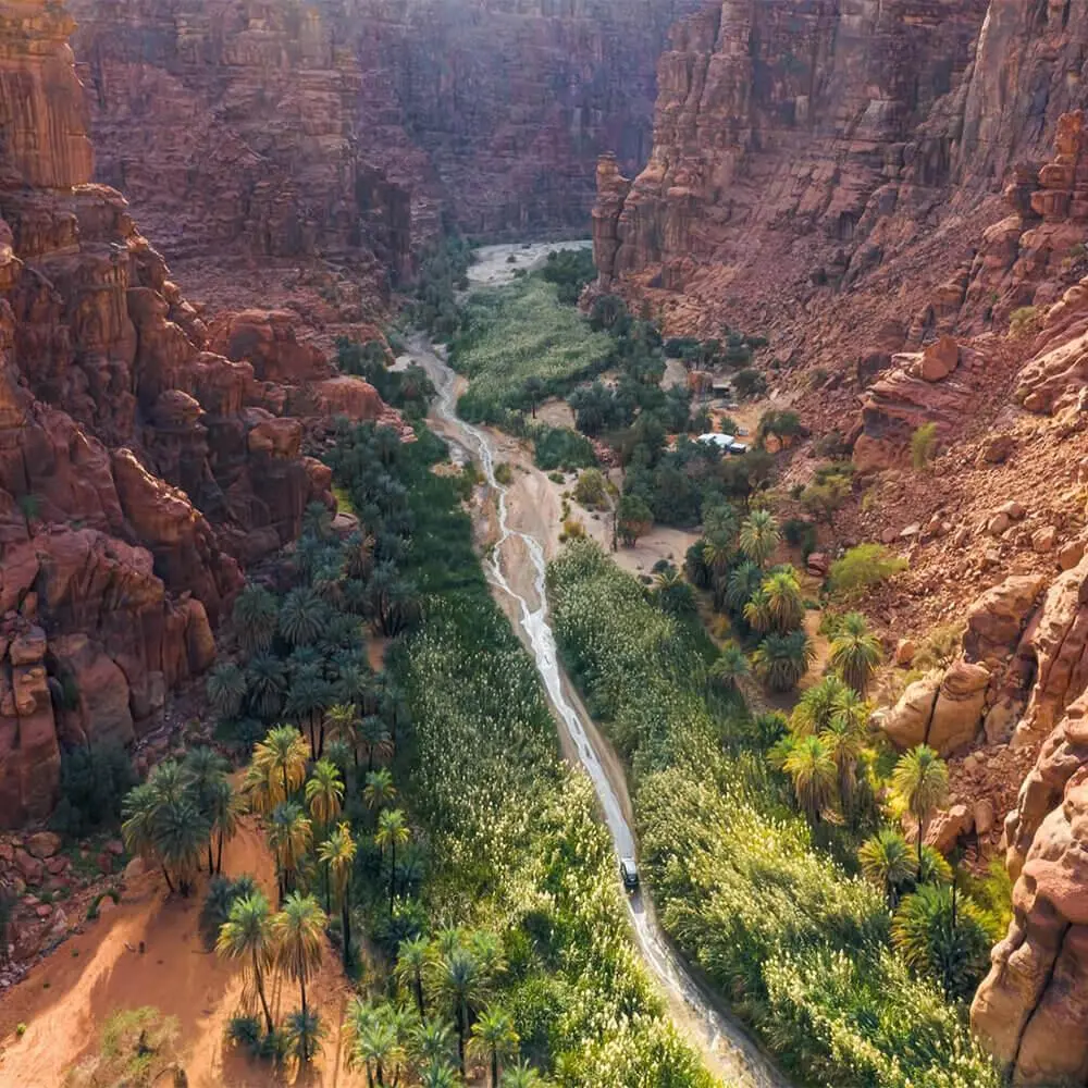After breakfast, depart AlUla and journey toward the breathtaking Wadi Disah, a hidden valley framed by towering sandstone cliffs and lush palms. Enjoy a picnic lunch amidst this dramatic oasis before continuing to Tabuk Airport for your domestic flight to Riyadh, the Kingdom’s capital.